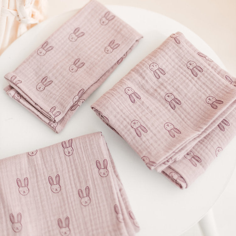 Our ultra-soft muslin baby swaddle blankets and burp cloths, made from 100% GOTS cotton double gauze, are a must-have for newborns. The breathable fabric helps prevent overheating, while the pastel lilac color with a charming bunnies print adds a sweet touch to any nursery.