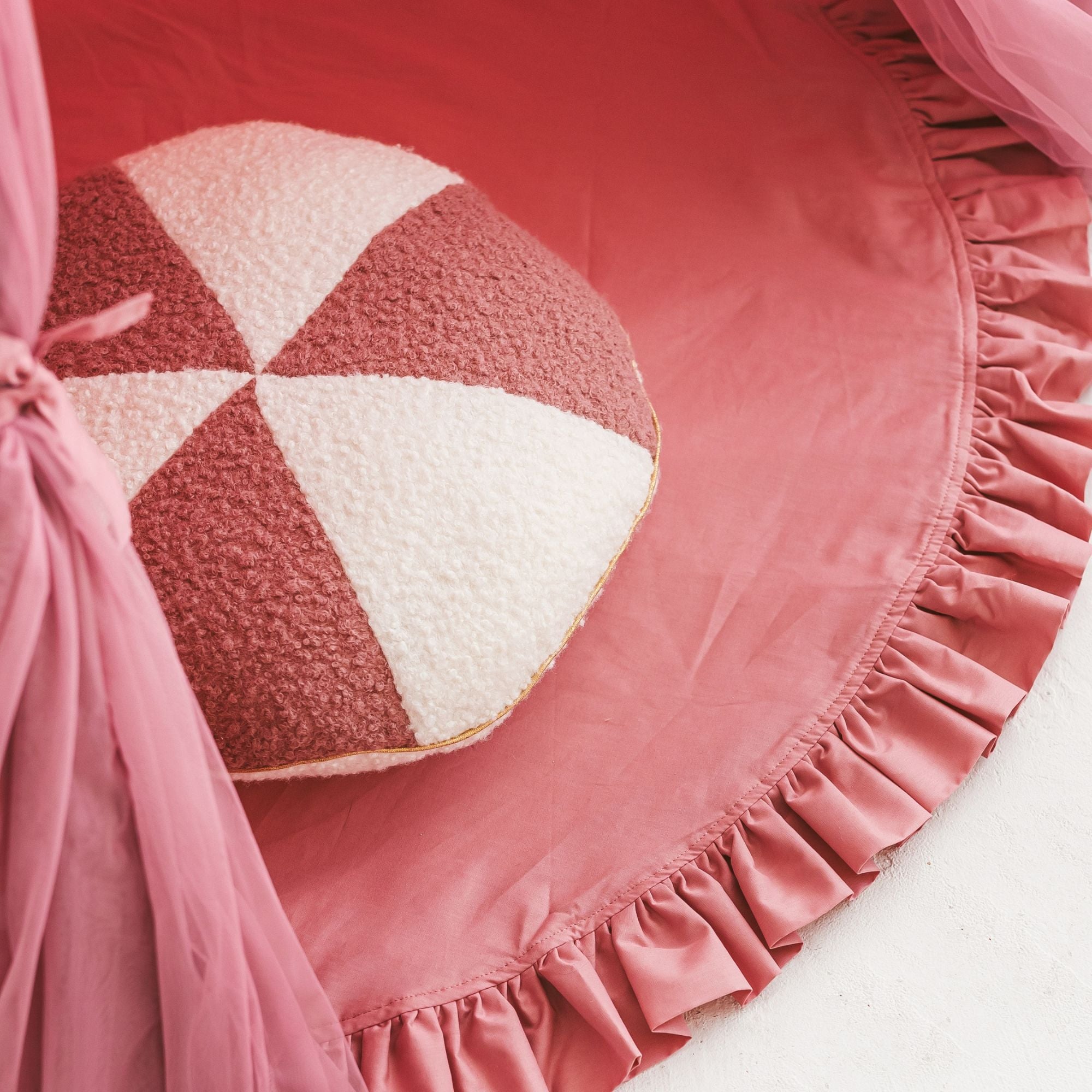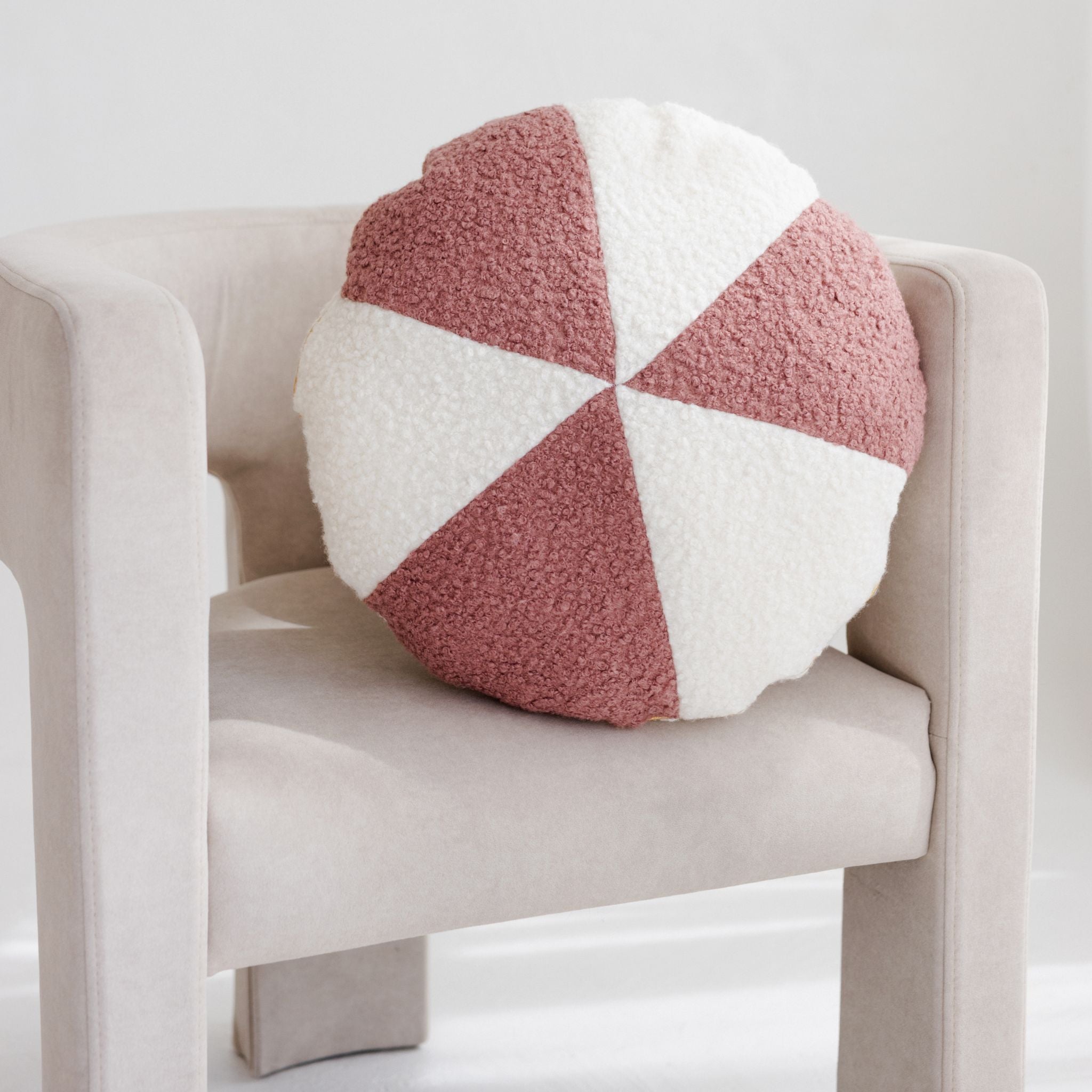Add a playful yet elegant touch to your space with the MINICAMP Bouclé Circus-Style Throw Pillow. Featuring a charming rose and white design, this decorative pillow is crafted from soft, textured bouclé fabric for a cozy feel. The chic golden trim enhances its sophisticated look, making it a perfect accent for nurseries, kids' rooms, or stylish living spaces. Whether used for comfort or decoration, this unique pillow brings warmth and character to any setting.