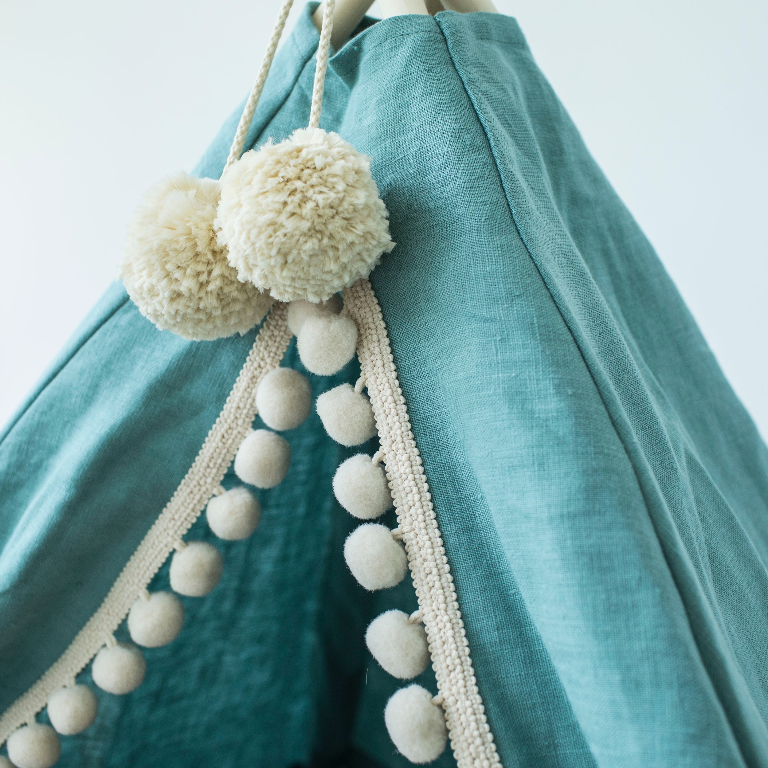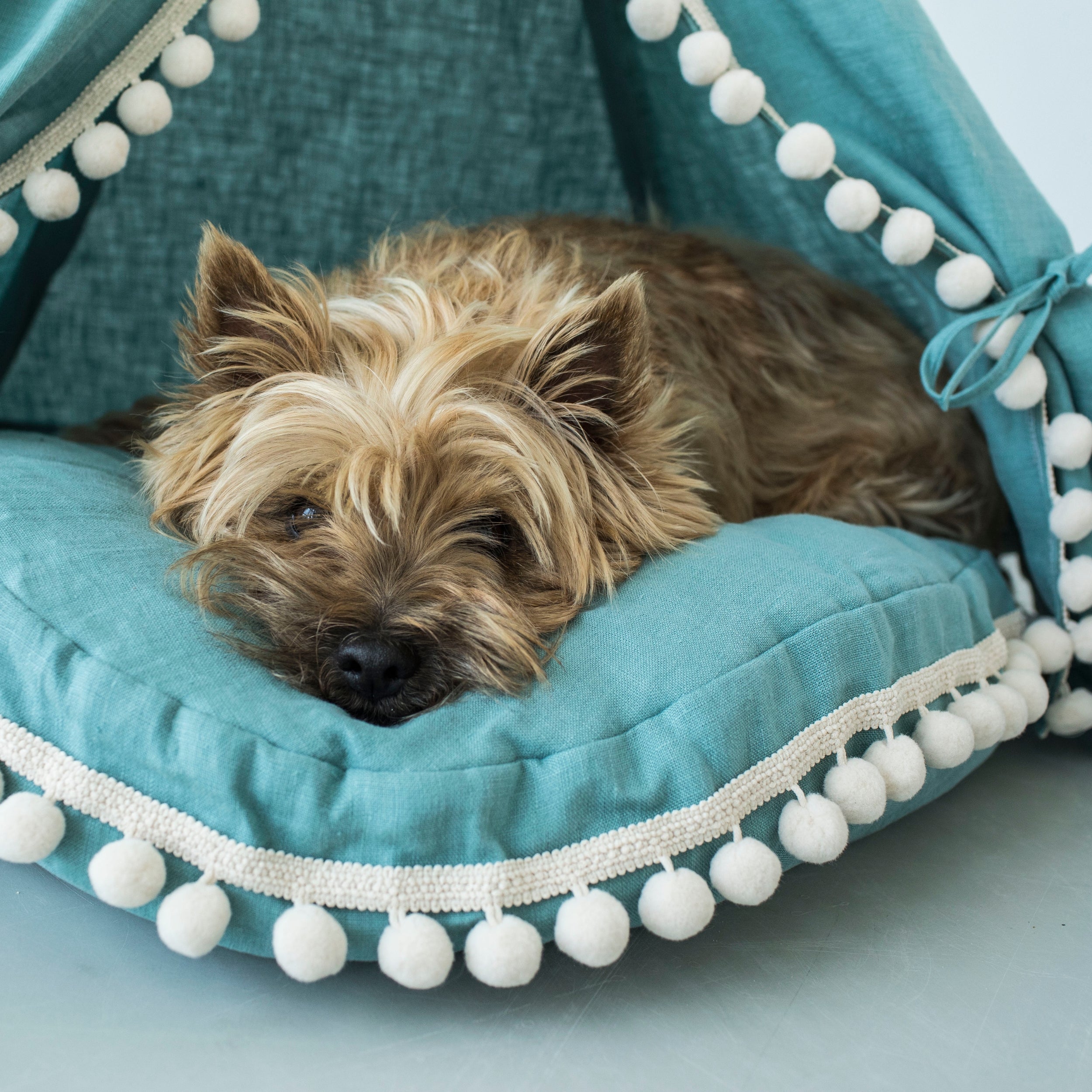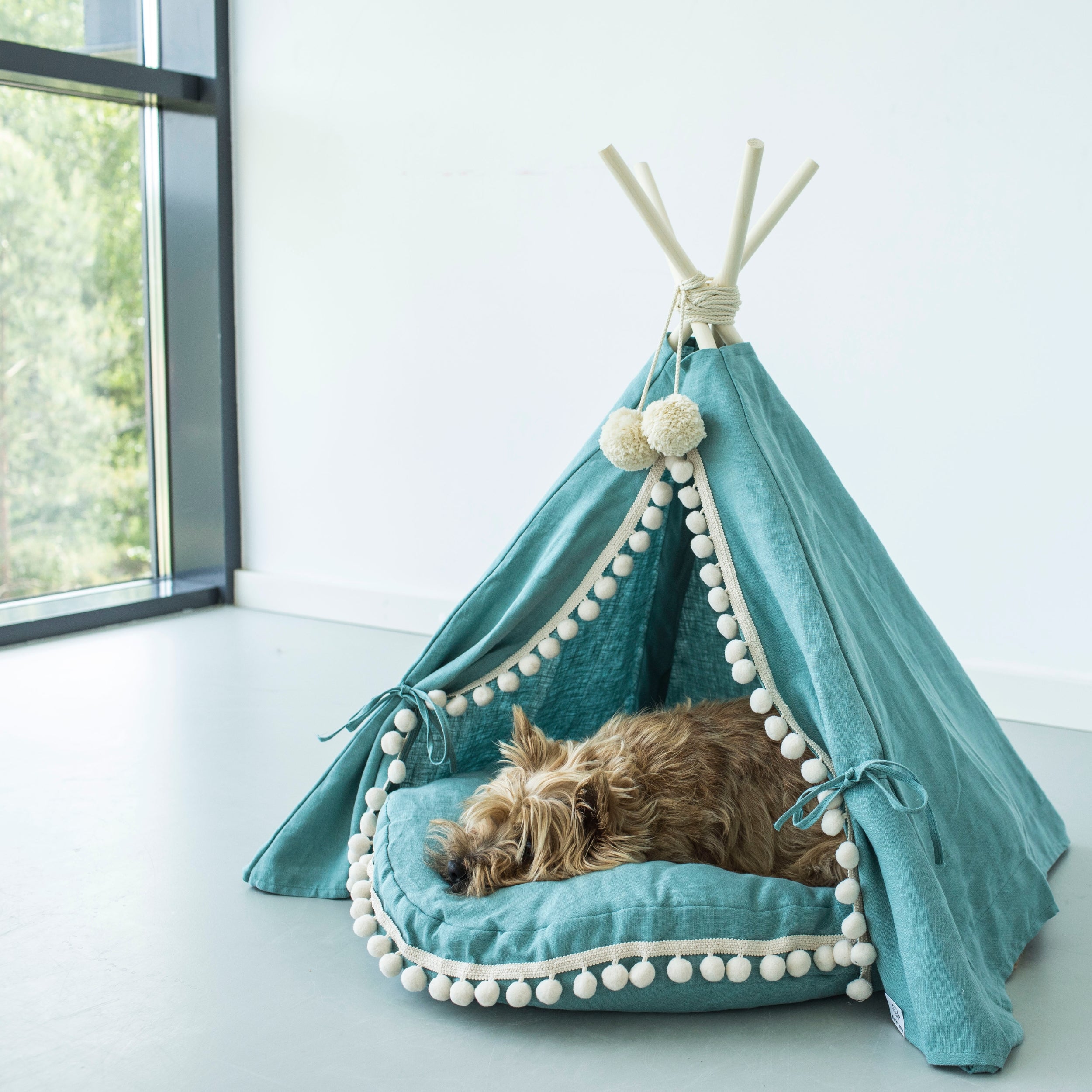 MINICAMP Dog and Cat Teepee in Turquoise Linen with Soft Pillow – Sizes S, M, L