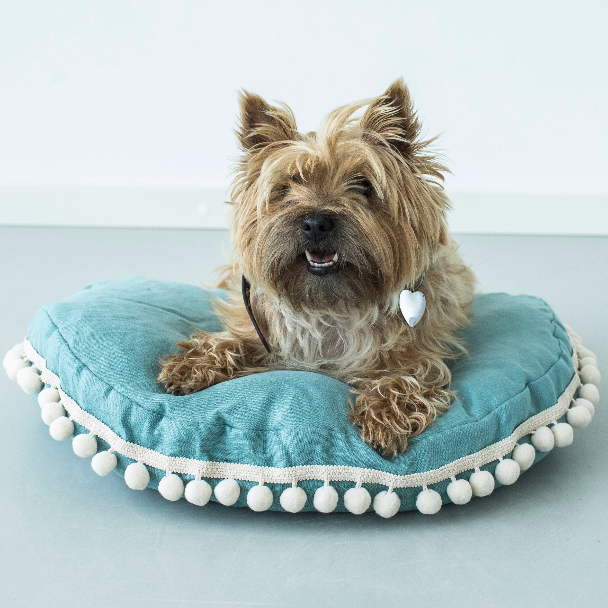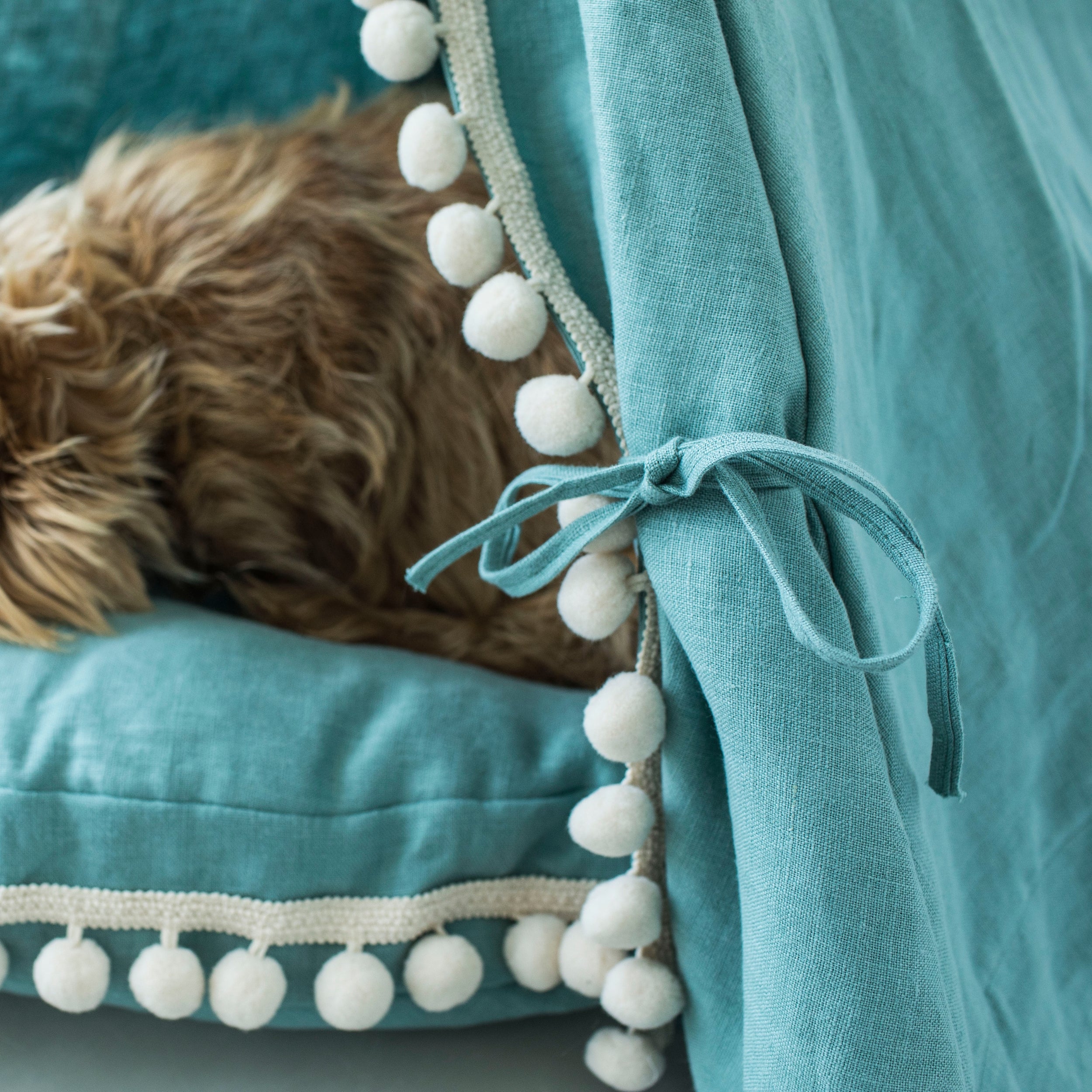 Crafted from 100% natural linen in a refreshing turquoise shade, it combines durability, breathability, and elegance. The included soft pillow ensures maximum comfort, making it an inviting haven for your furry companion.