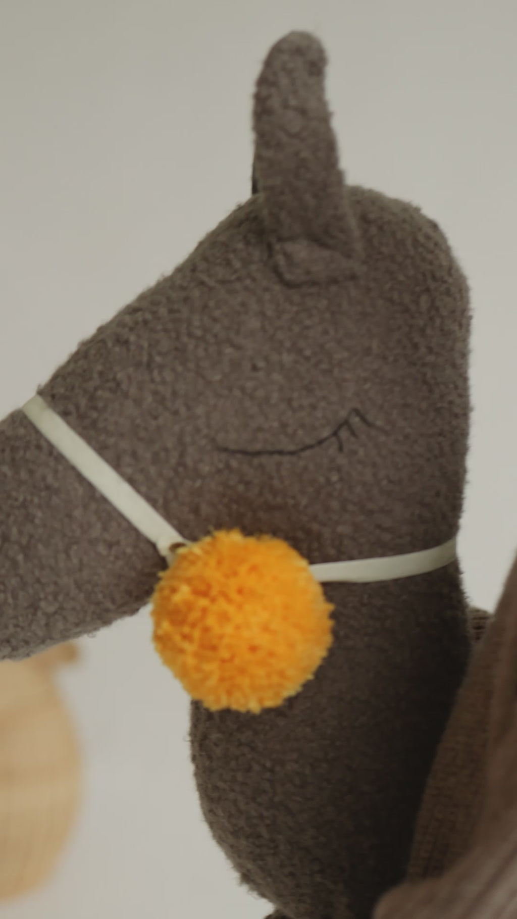 Create unforgettable adventures with this llama alpaca-themed stick horse in a delicate rose hue. Handcrafted from high-quality bouclé fabric, it features delightful accents such as two handmade pom poms, a silver tassel on the ear, and hand-embroidered eyes and mouth. Each piece is a one-of-a-kind, lovingly crafted treasure.