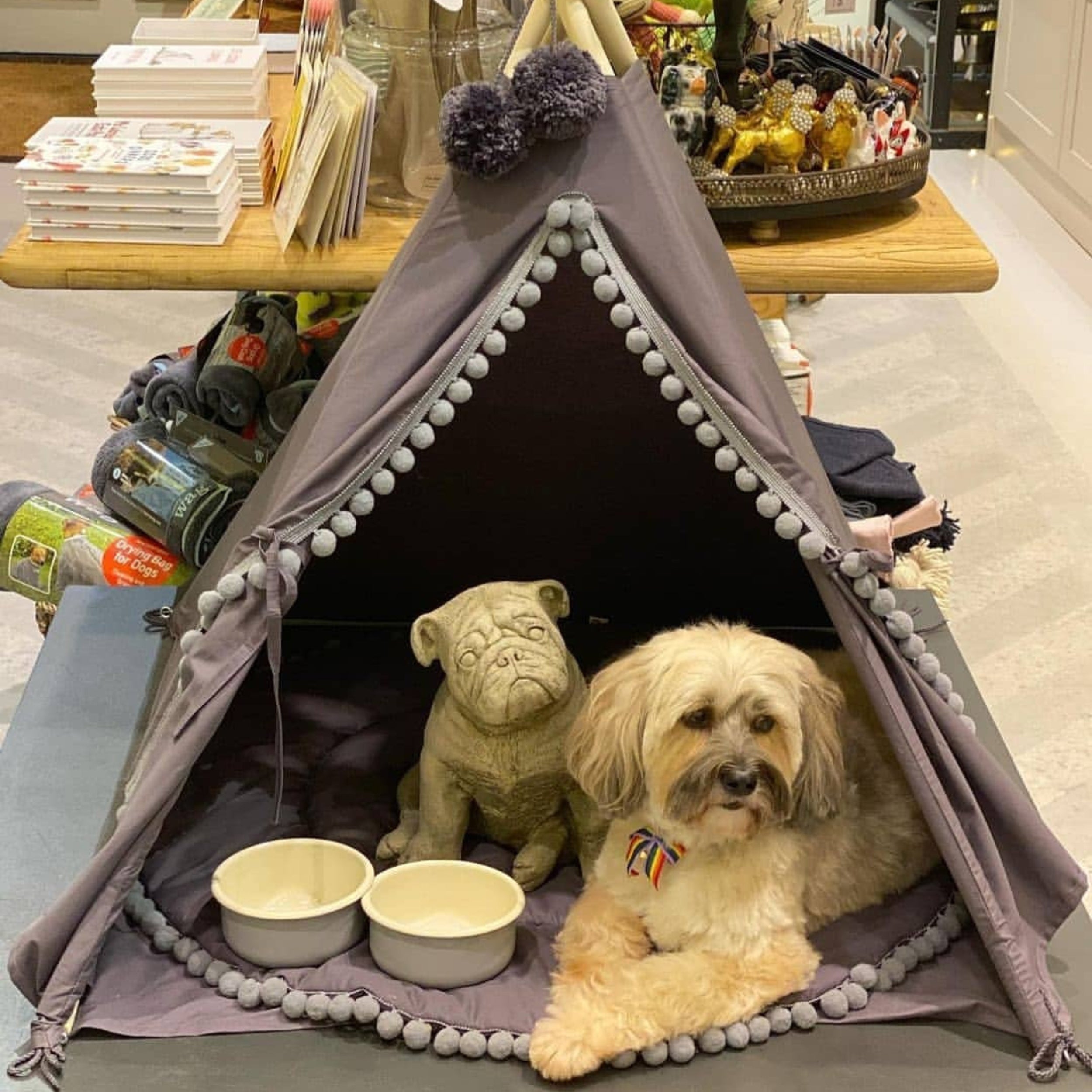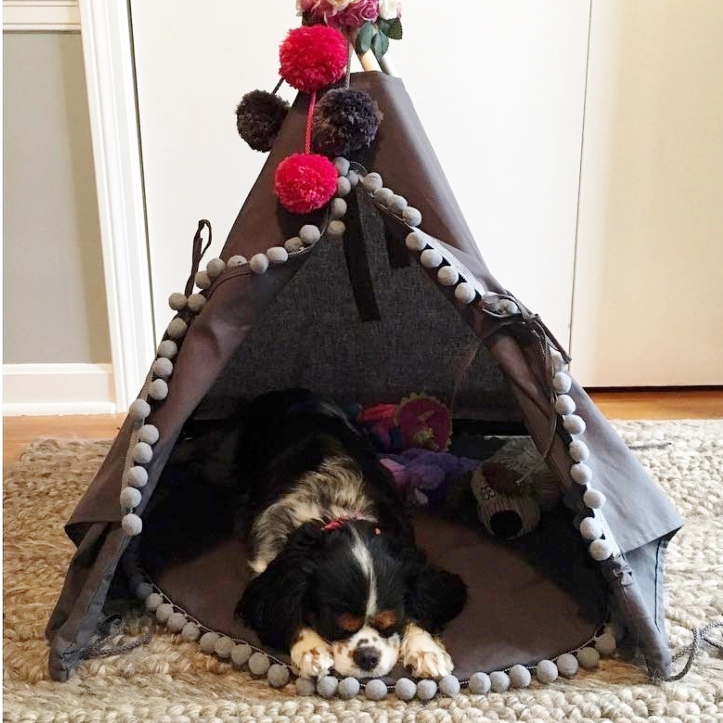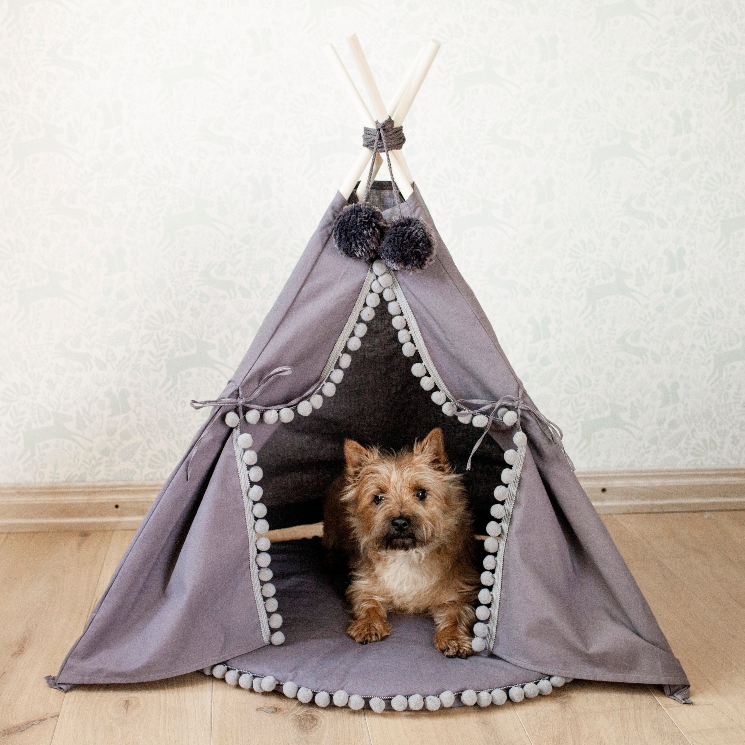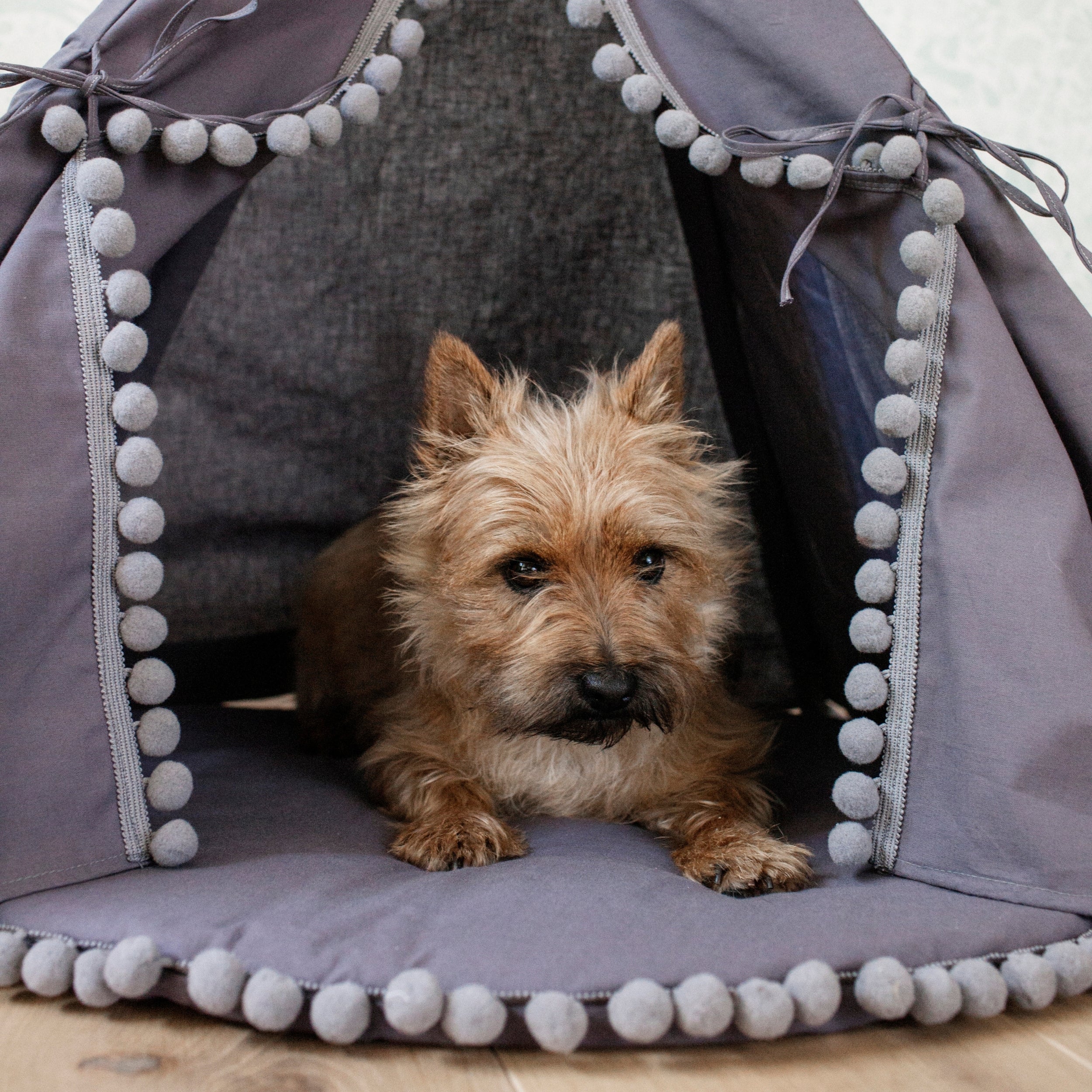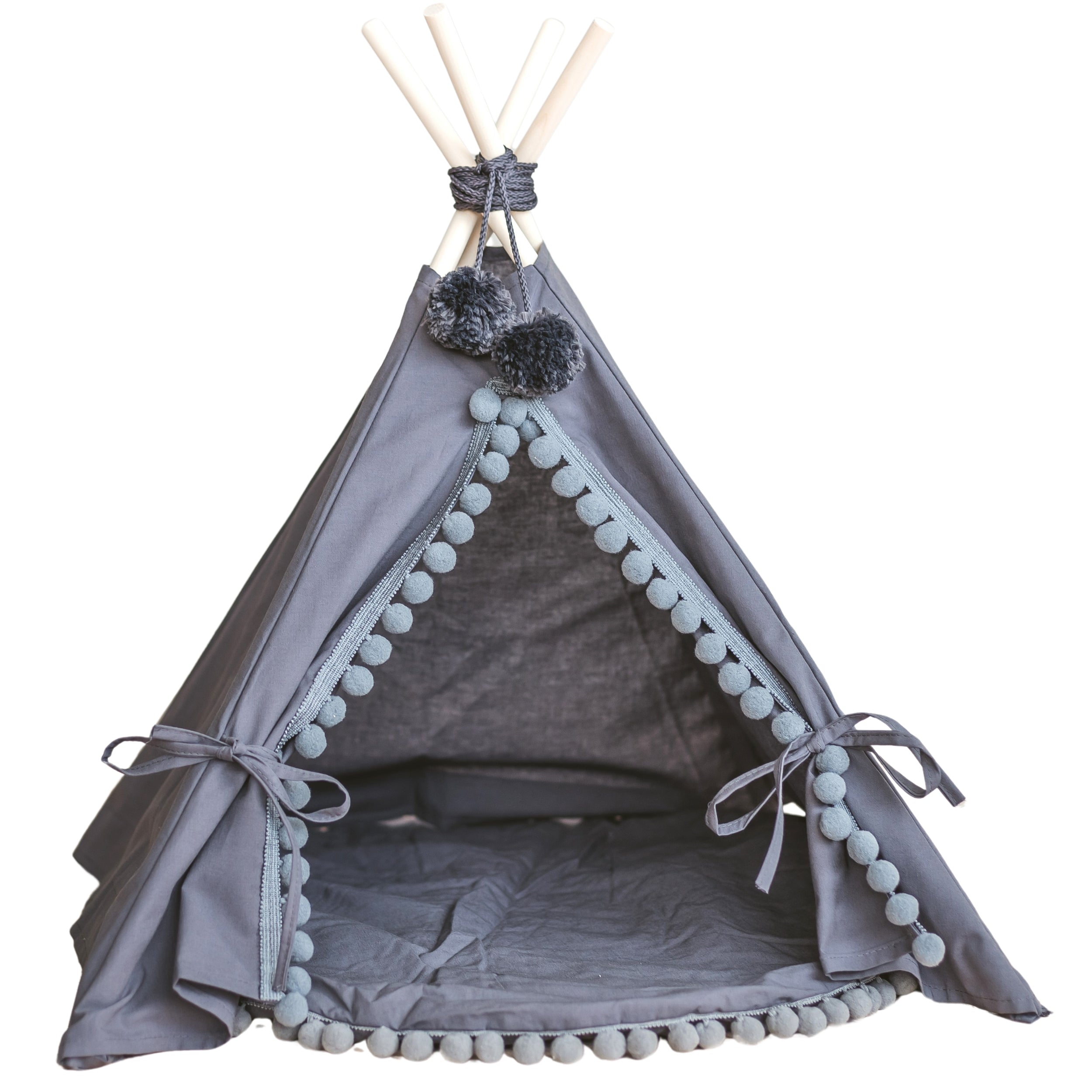 MINICAMP Teepee for Cats, Dogs & Rabbits in Grey with Pompoms – Sizes XS, S, M, L