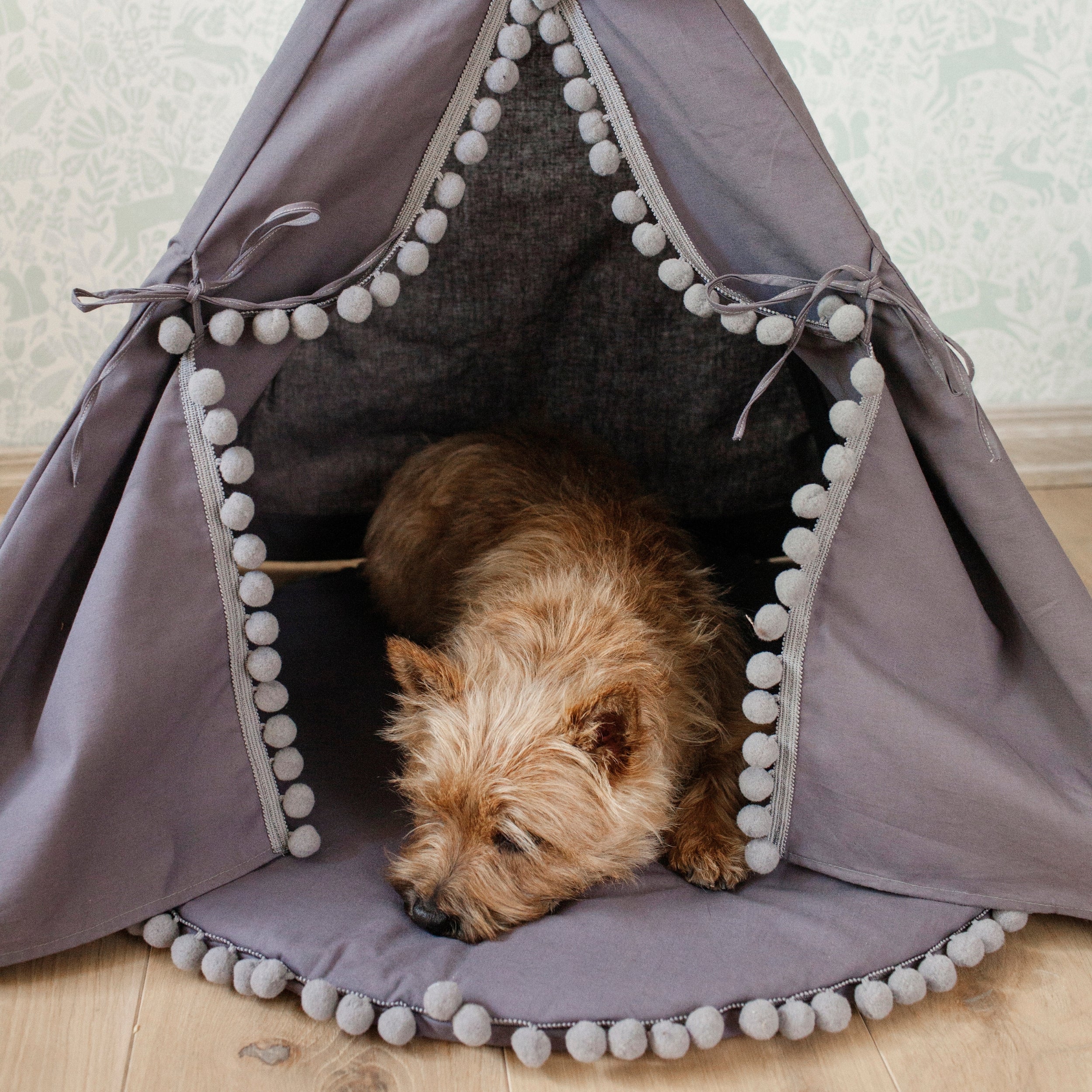 Crafted from 100% natural, OEKO-TEX® certified cotton fabric, this teepee is both durable and pet-safe. Its elegant grey color and playful pompom details make it a stylish addition to any room.