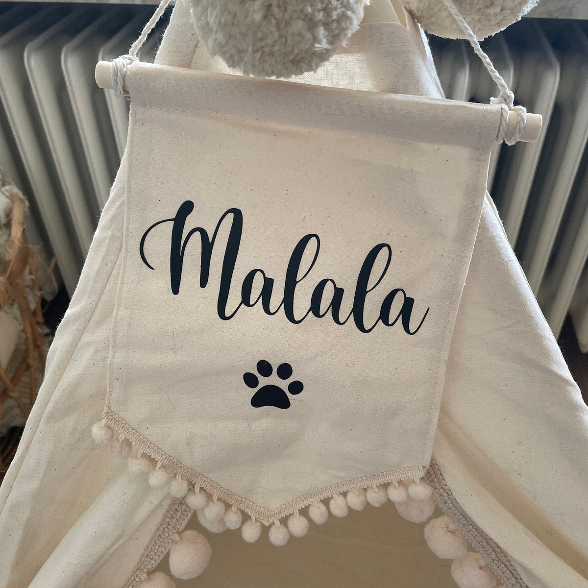 This cute name banner hangs easily on a wooden dowel and is made from 100% cotton canvas. It’s double-sided, with the pet’s name printed on one side in black, along with a small paw print next to the name for an extra charming touch. The lower edges of the banner feature stylish matching pompoms, and the ergonomic strings make it simple to hang over the teepee or any other place in the room.