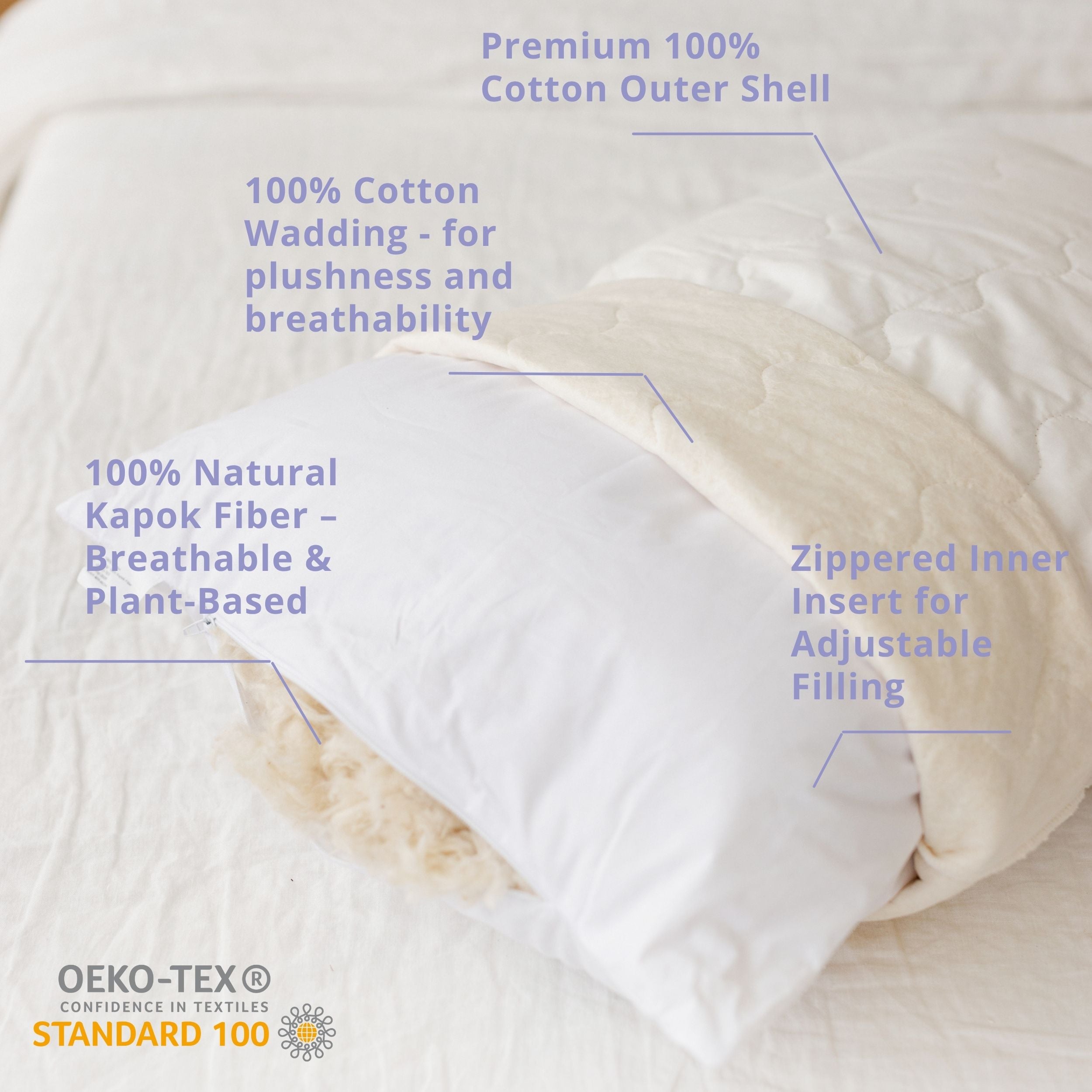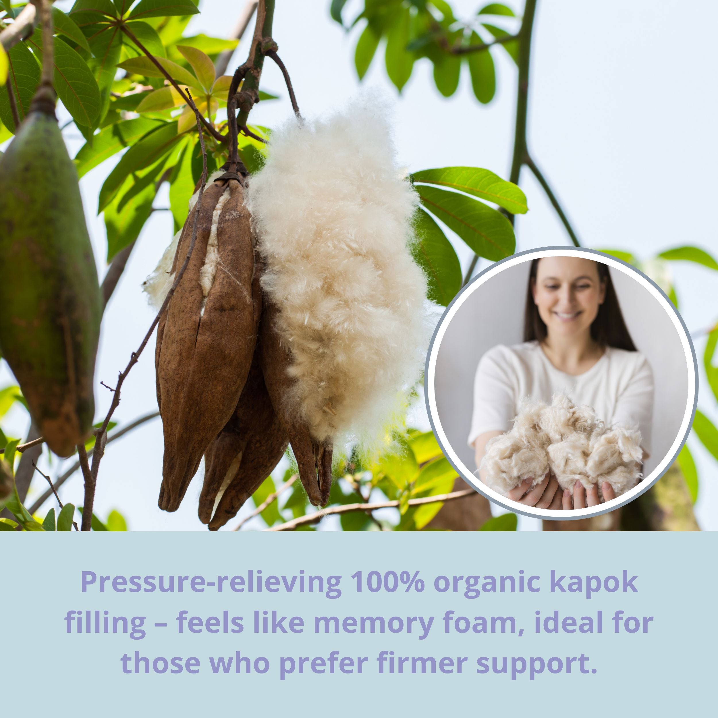 - Filled with 100% natural kapok – a soft, airy plant fiber known for its breathable qualities.