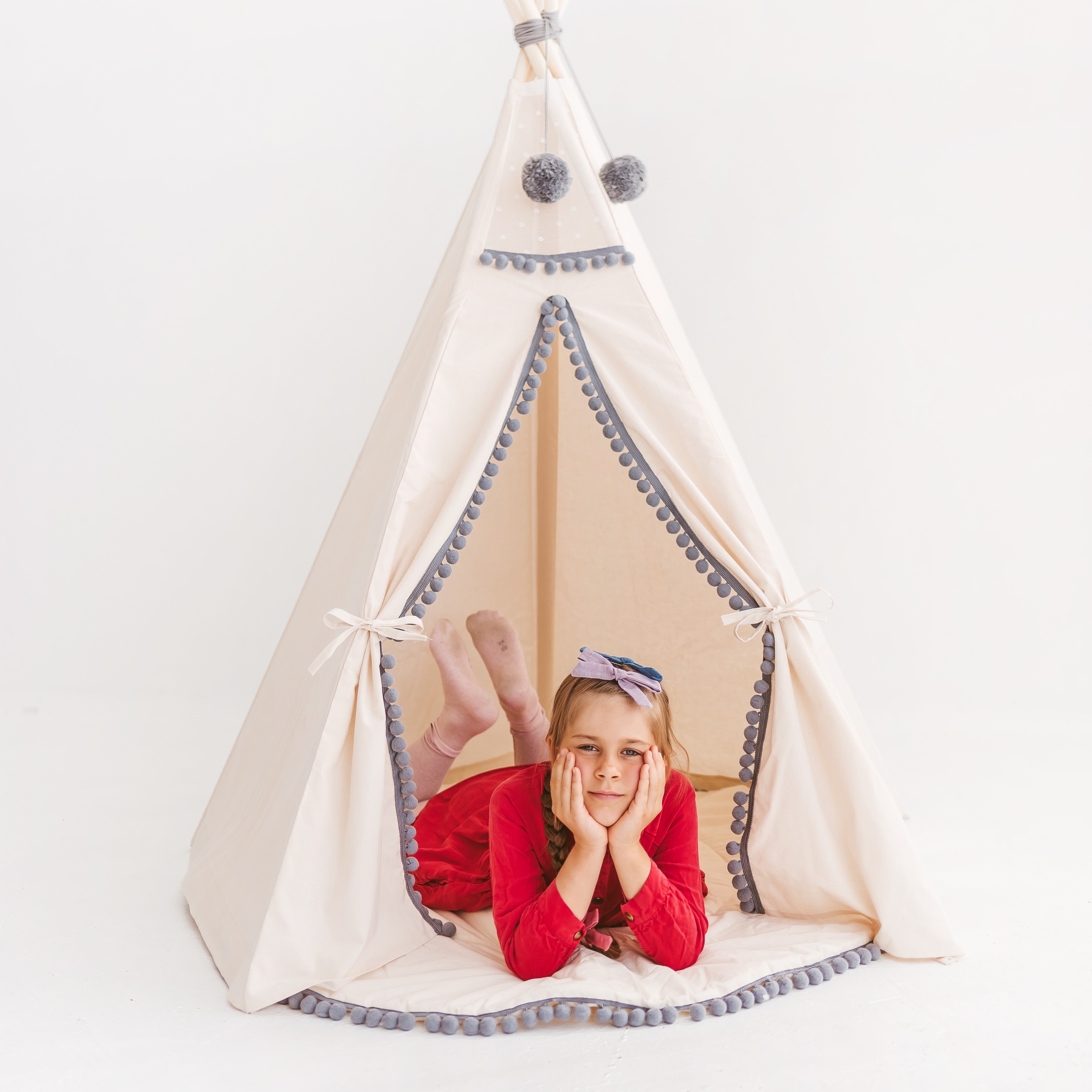 Dekoras: In Grey tipi palapinės priekis dekoruotas pilka burbuliukų juosta, kas dizainui suteikia subtilaus žaismingumo.
