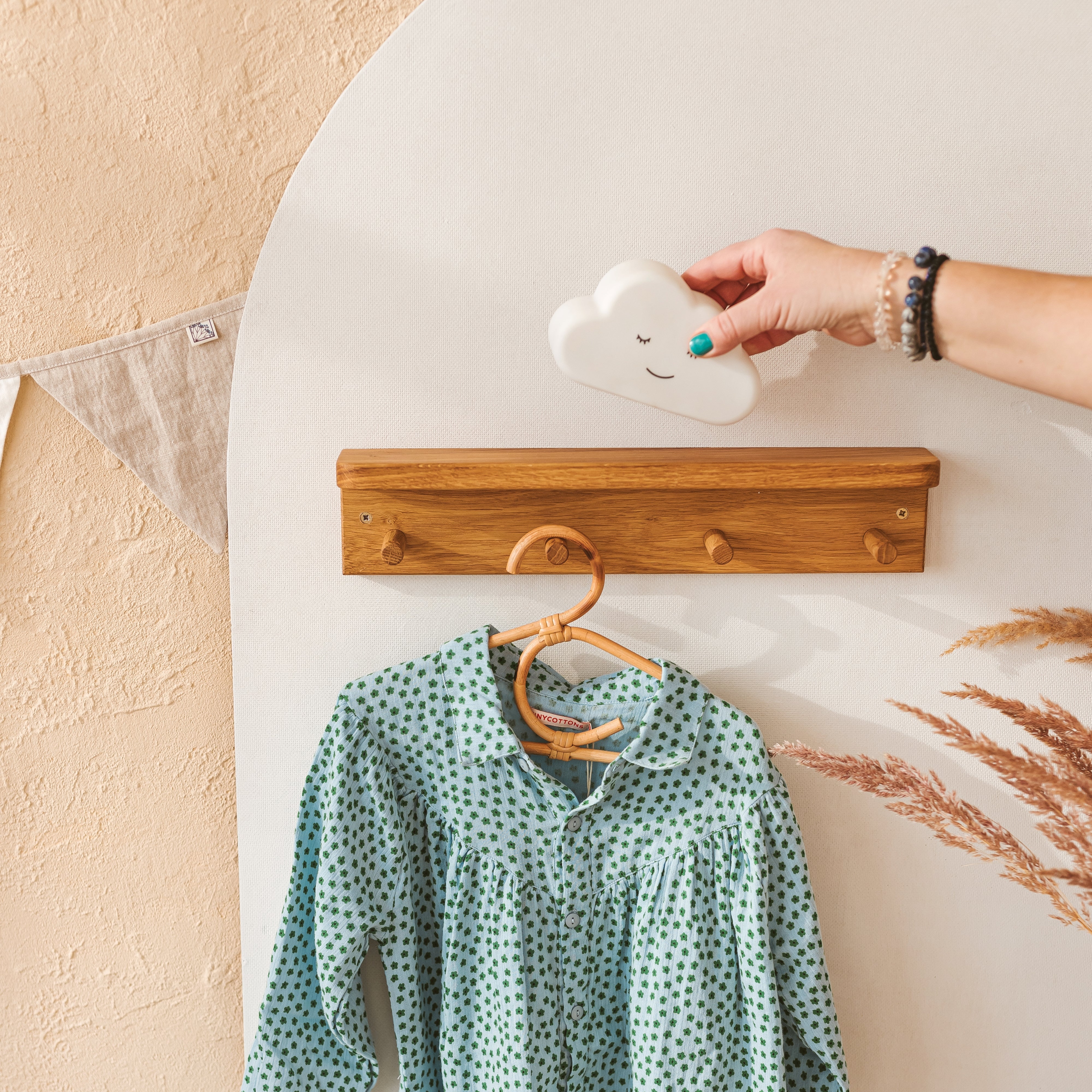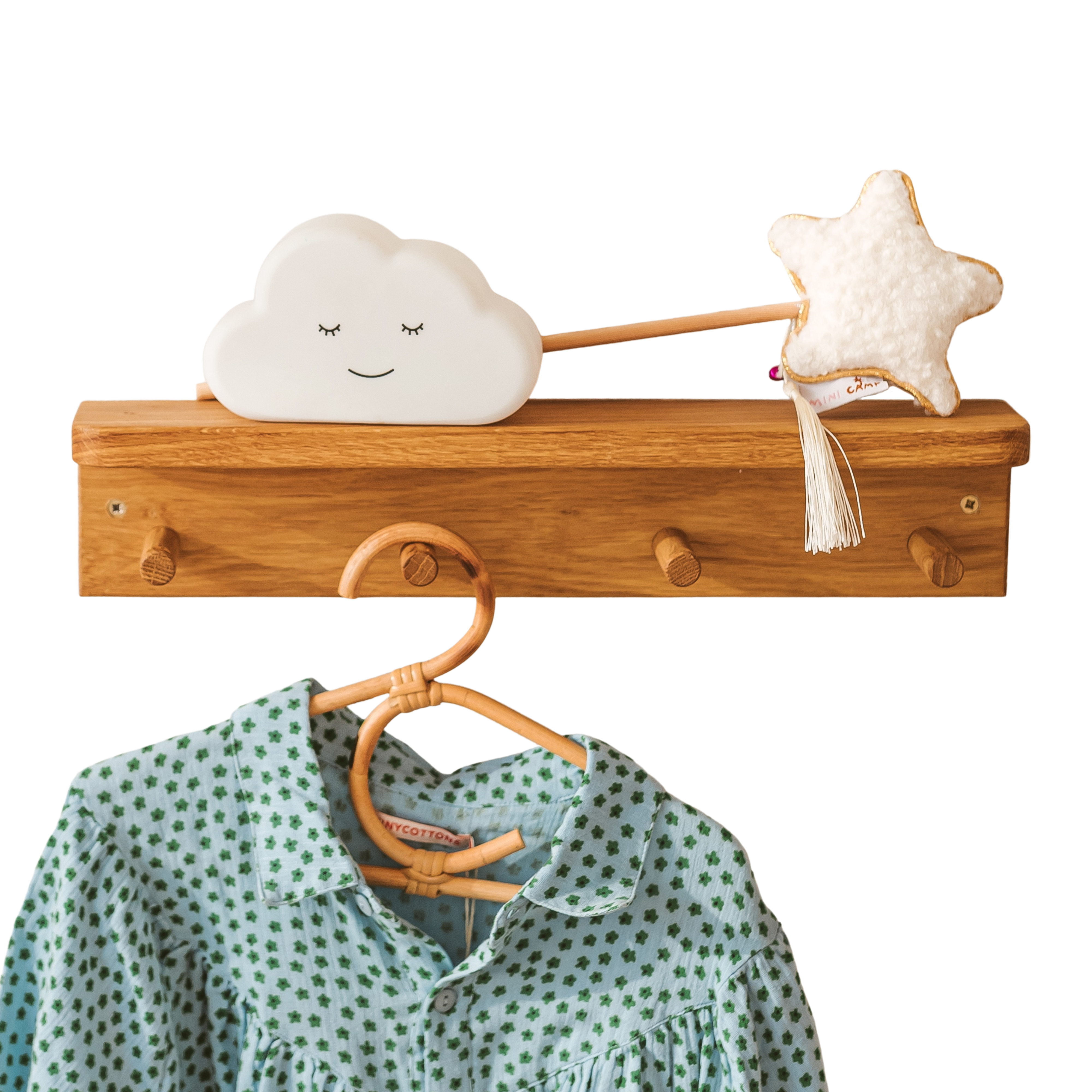 Nuo jūsų vaikų darželio iki prieškambario – mediniai palto kabliukai MINICAMP su plaukiojančia knygų lentyna yra puikus organizavimo sprendimas bet kokiam kambariui. Šie sieniniai kabliukai su plokščia viršutine lentyna ir 4 mediniais kaiščiais puikiai tinka drabužiams laikyti ir pakabinti bei jūsų vaiko mėgstamoms knygoms rodyti. Šios ąžuolo masyvo rankų darbo lentynos puikiai papildys bet kurią jūsų namų erdvę.