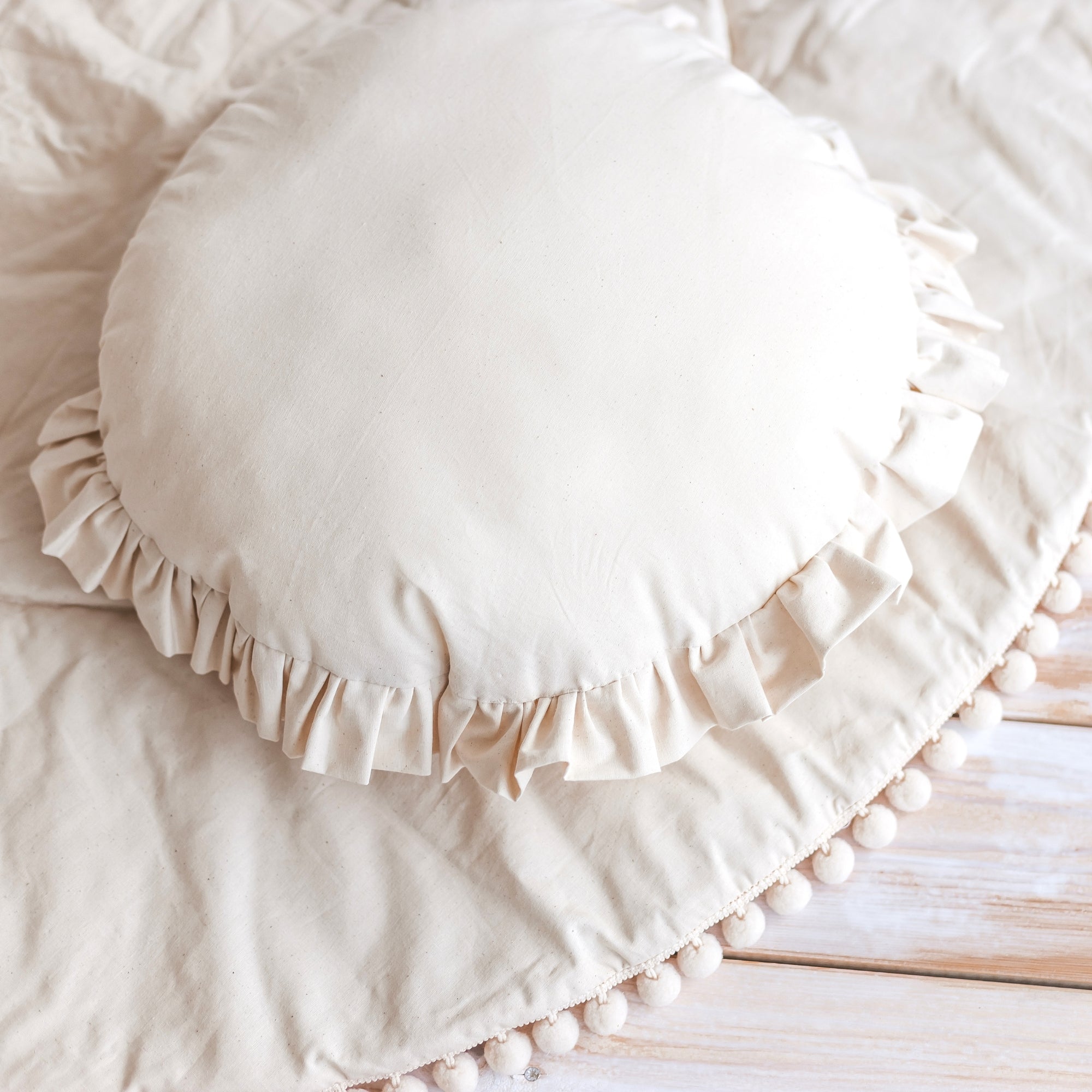 Suteikite savo erdvei jaukaus, elegantiško prisilietimo su šia apvalia pagalve su raukiniais papuošimais! Pagaminta iš natūralios OEKO-TEX medvilnės, puikiai tinka vaikų kambariui, darželiui ar bet kokiam jaukiam jūsų namų kampeliui.